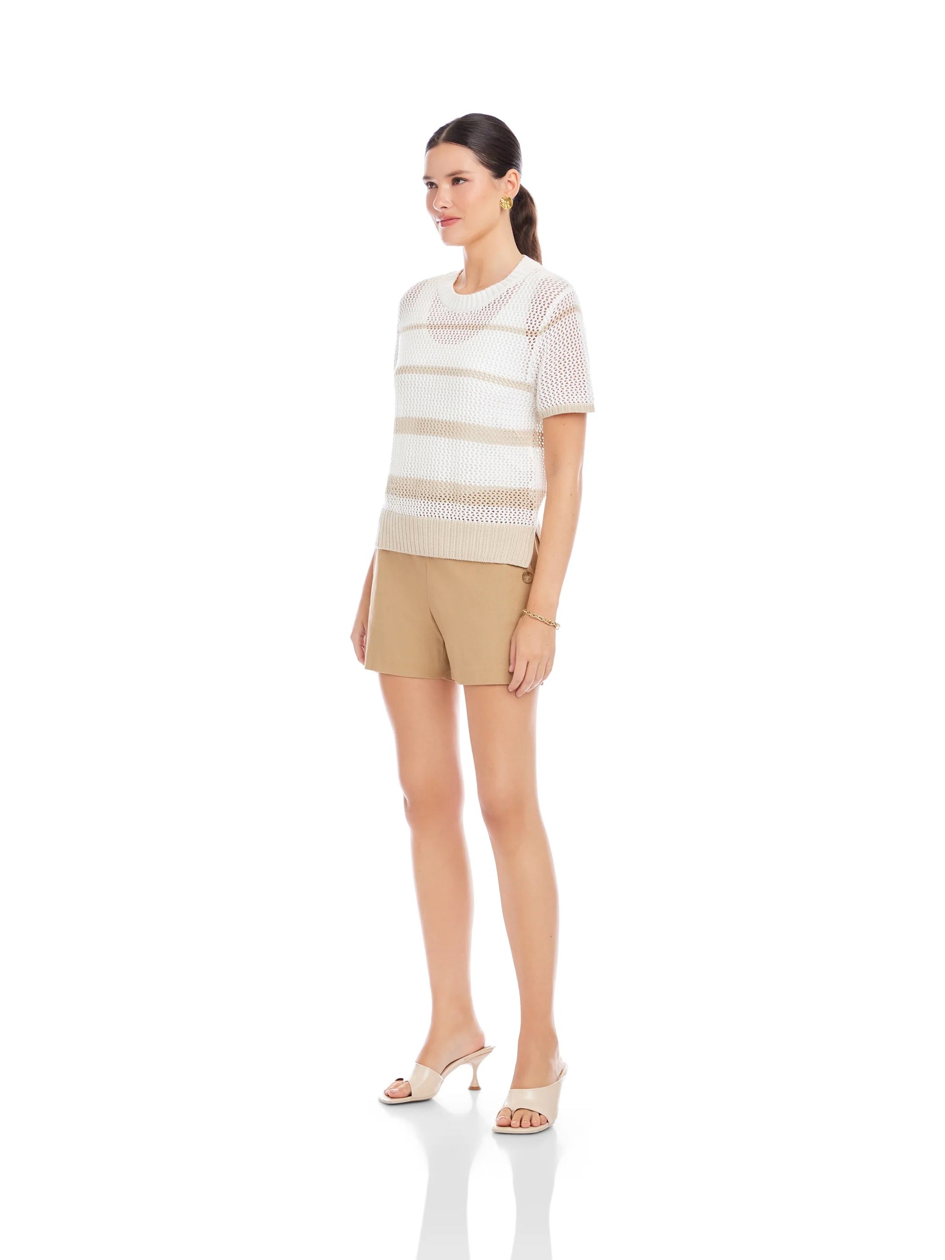 The Faye Crochet Sweater Top is a lightweight open-knit design that brings airy texture and effortless polish to warm-weather dressing. Featuring a classic crew neckline and short sleeves, this pull-on style is crafted in a semi-sheer crochet pattern that layers beautifully over your favorite camisole (cami not included).