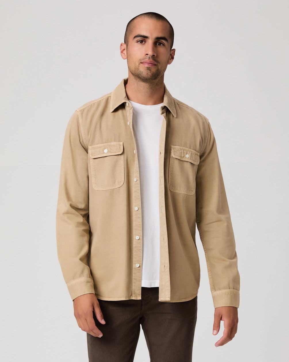 This long sleeve button up is a year-round menswear must-have. Made from a lightweight, incredibly soft sueded twill fabric in a vintage-inspired muted beige hue, the Martin Shirt is designed with a regular fit, double chest pocket with a button detail and contrast stitching for a utilitarian feel