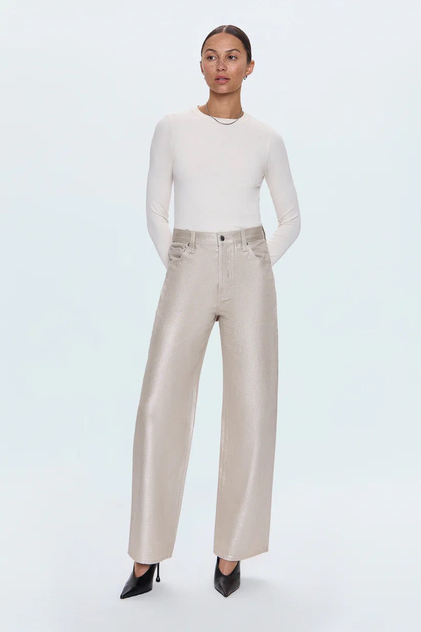 A signature shape, Tate features a high rise, bowed wide leg, and full-length 32" inseam that creates elegant movement and modern proportion. Crafted from 100% cotton non-stretch denim in Champagne Luster, a pearly coated finish that reflects light with every step for an effortlessly elevated look.