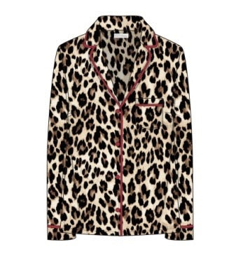 Women’s modal jersey pajama button-down top in leopard print with red piping trim.